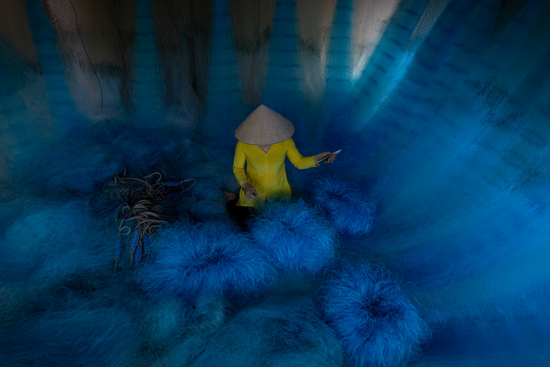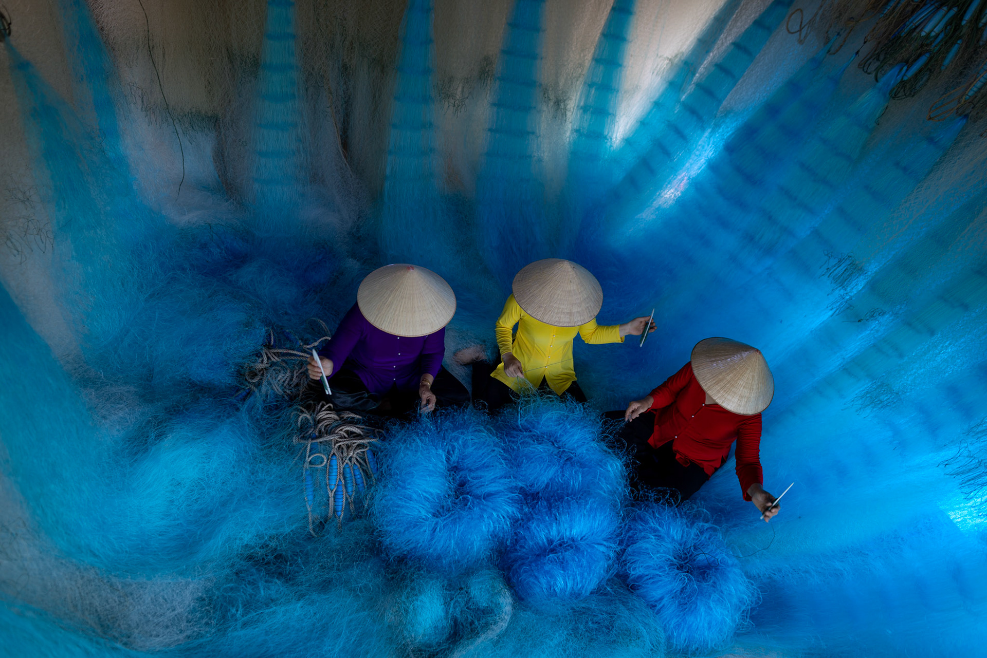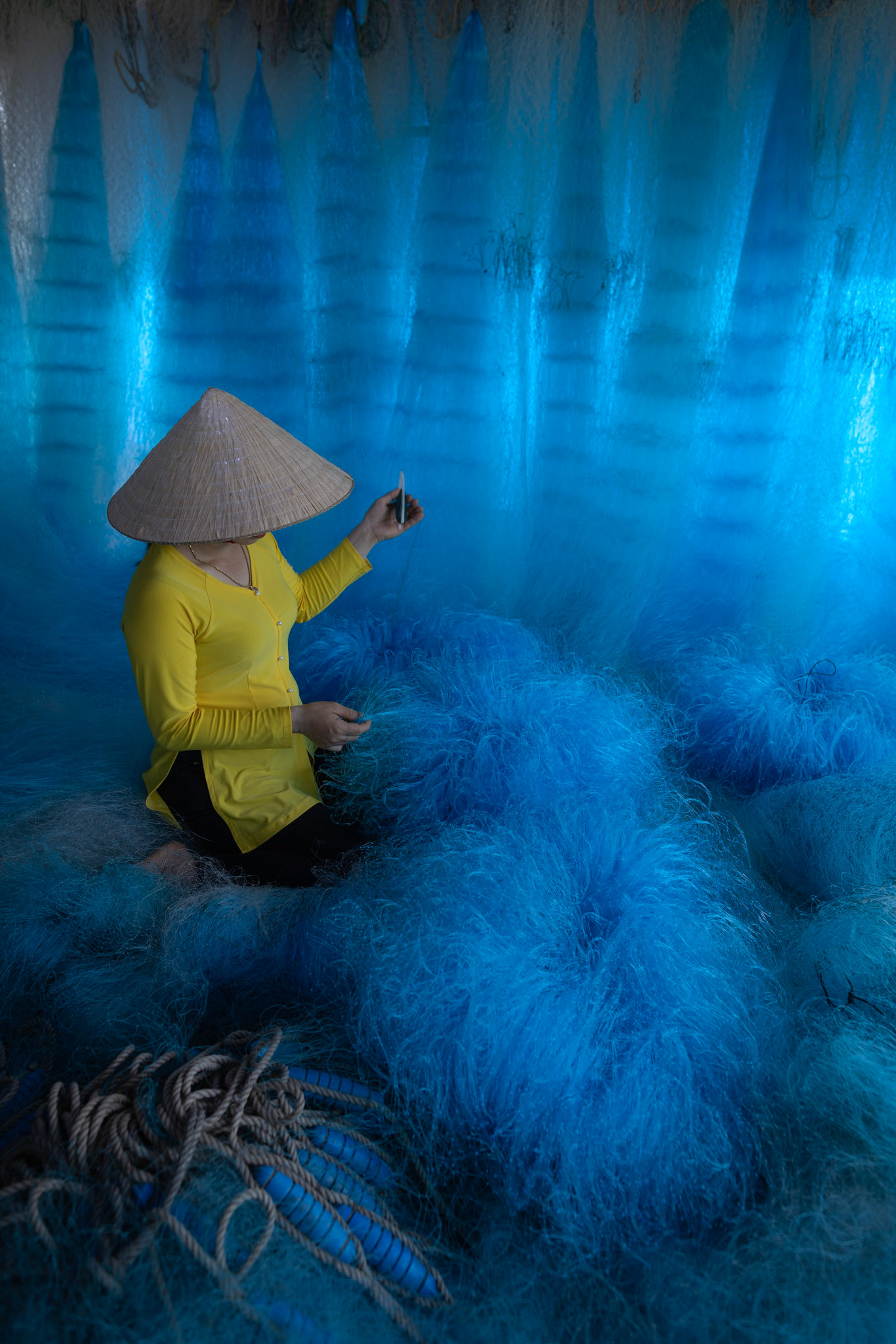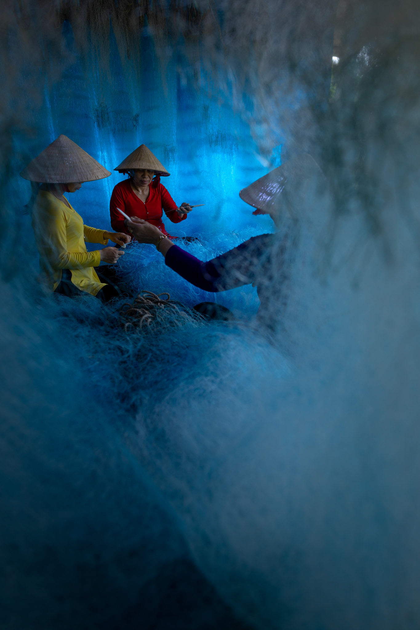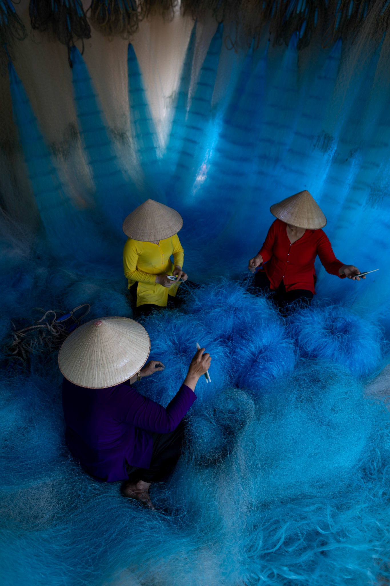Step into the intricate, chaotic beauty of a traditional net weaving workshop. This visual essay explores the rhythmic labor and profound scale of an ancient craft. Bathed in a striking, natural color palette—where the cool, oceanic cyan of massive fishing nets meets the warm, golden light illuminating the workers—this series captures the atmospheric intensity of the environment. From the sweeping, geometric lines of the hanging nets to the intimate, calloused details of the hands that mend them, these images are a tribute to the focused artisans who weave the fabric of the sea. Vietnam 2026