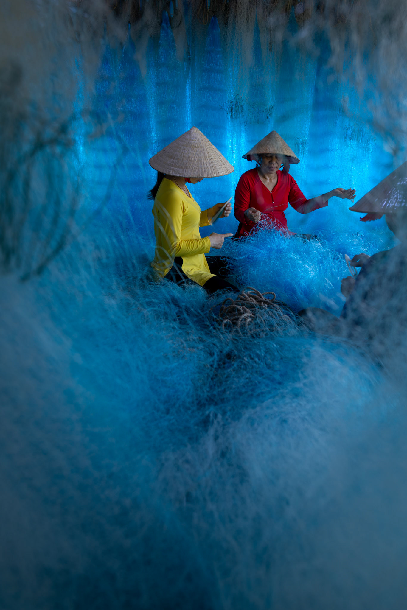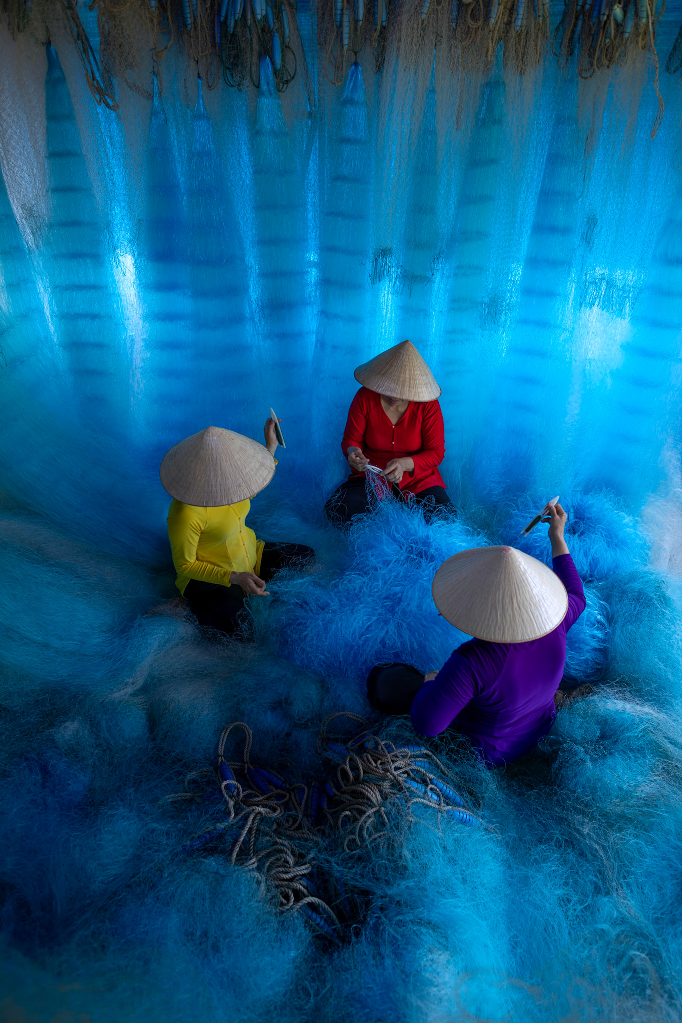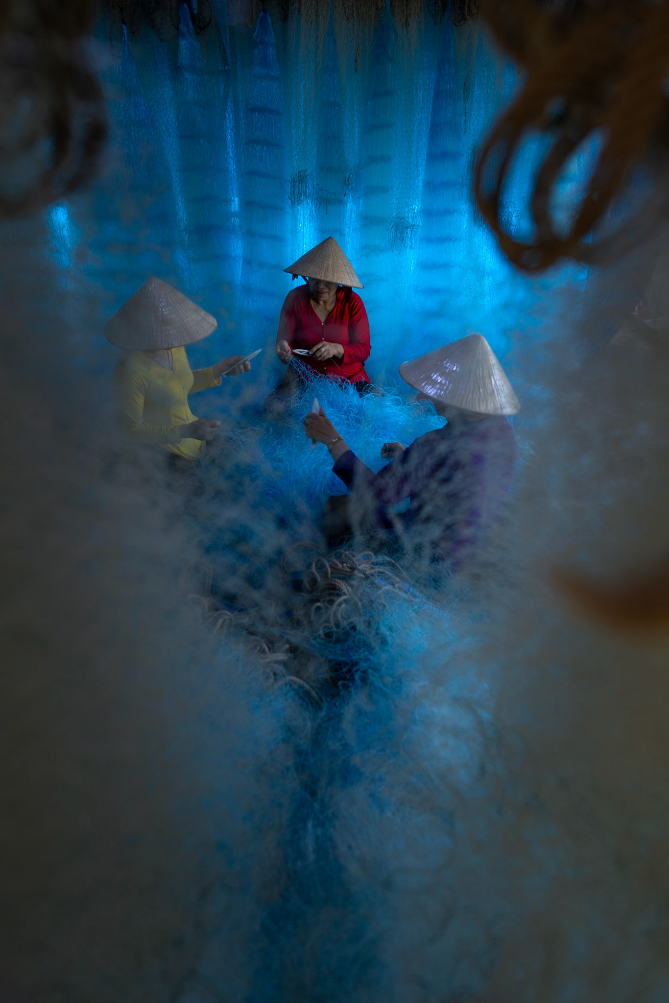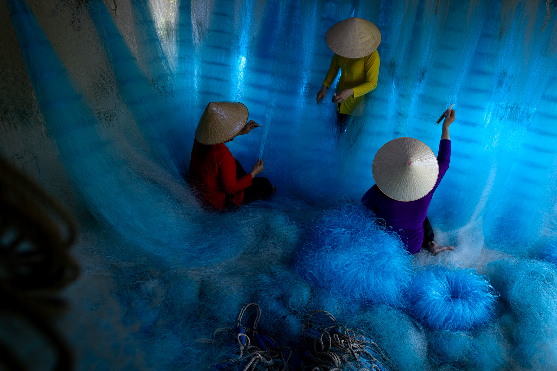 Step into the intricate, chaotic beauty of a traditional net weaving workshop. This visual essay explores the rhythmic labor and profound scale of an ancient craft. Bathed in a striking, natural color palette—where the cool, oceanic cyan of massive fishing nets meets the warm, golden light illuminating the workers—this series captures the atmospheric intensity of the environment. From the sweeping, geometric lines of the hanging nets to the intimate, calloused details of the hands that mend them, these images are a tribute to the focused artisans who weave the fabric of the sea. Vietnam 2026