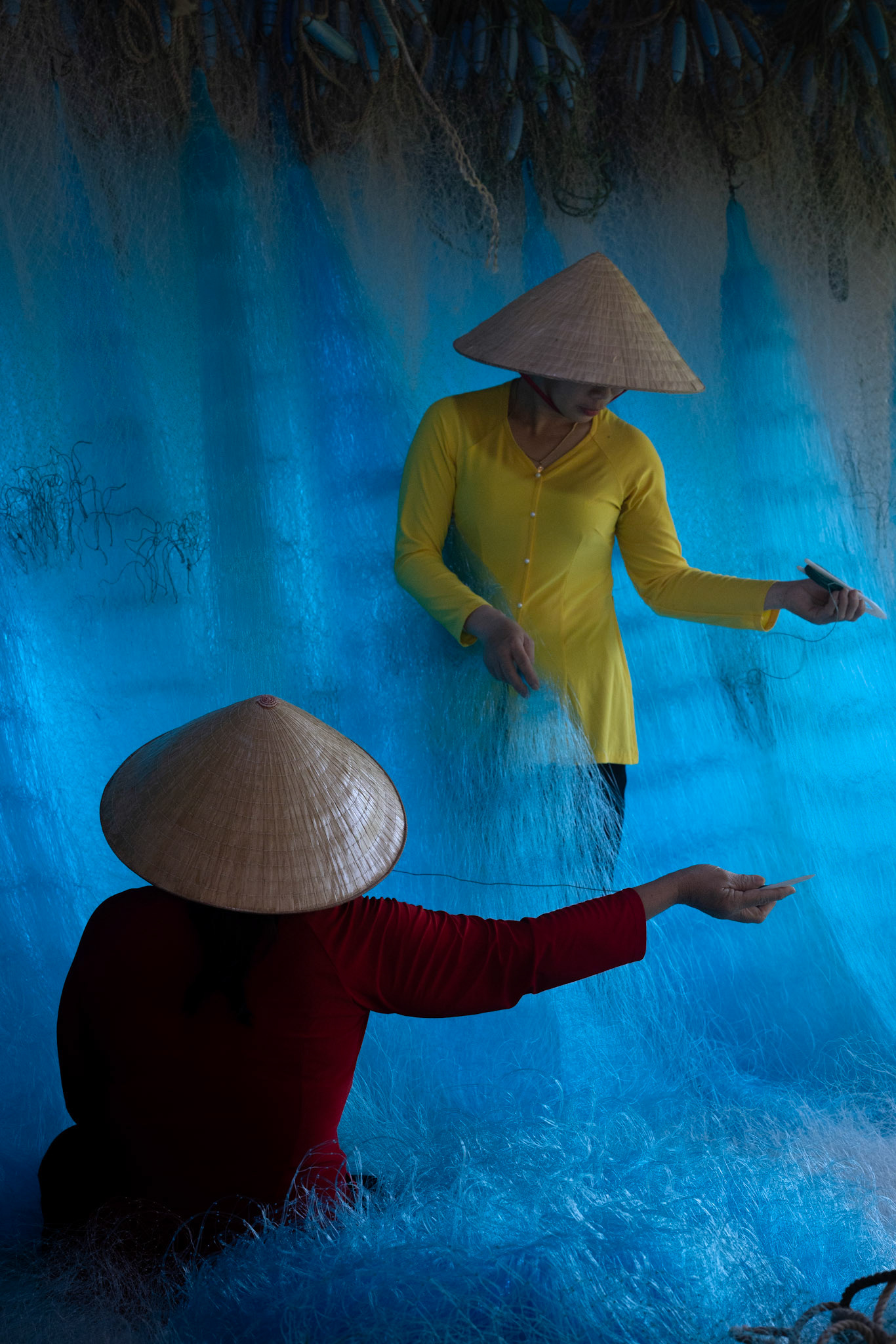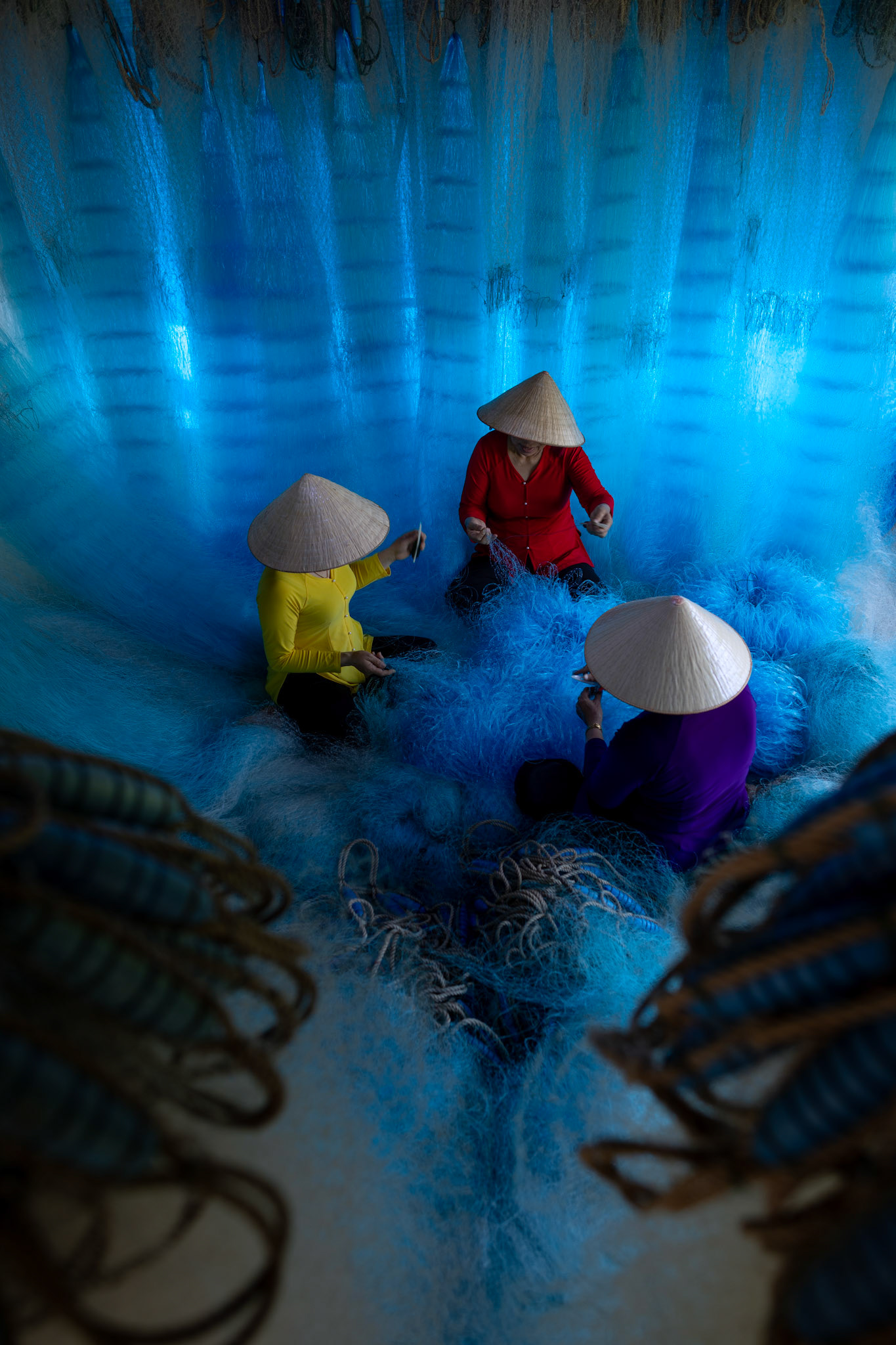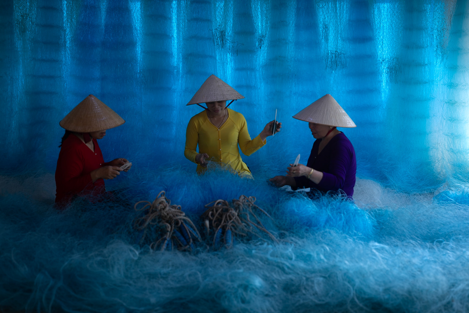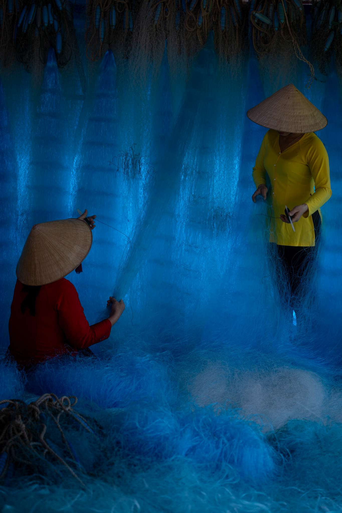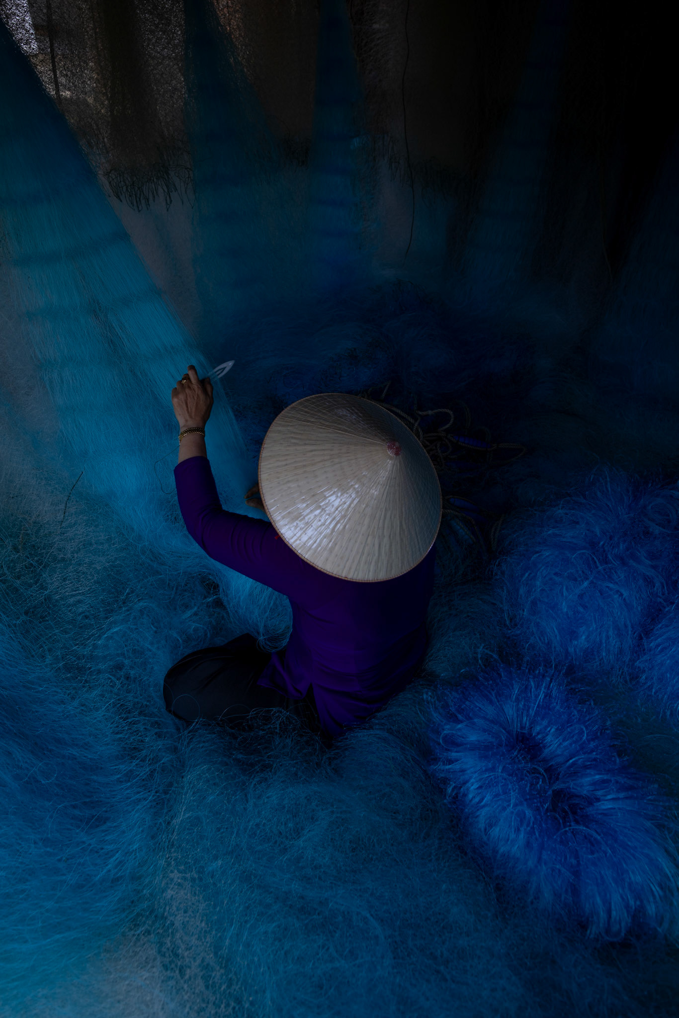 Step into the intricate, chaotic beauty of a traditional net weaving workshop. This visual essay explores the rhythmic labor and profound scale of an ancient craft. Bathed in a striking, natural color palette—where the cool, oceanic cyan of massive fishing nets meets the warm, golden light illuminating the workers—this series captures the atmospheric intensity of the environment. From the sweeping, geometric lines of the hanging nets to the intimate, calloused details of the hands that mend them, these images are a tribute to the focused artisans who weave the fabric of the sea. Vietnam 2026