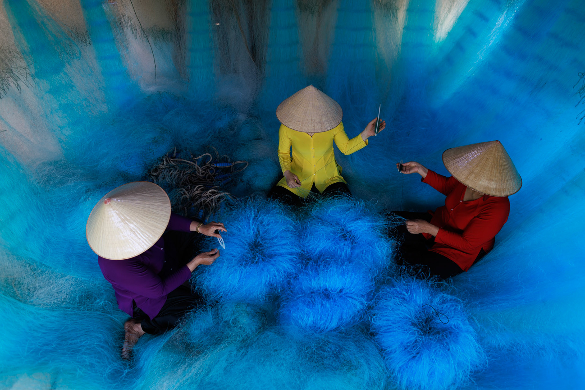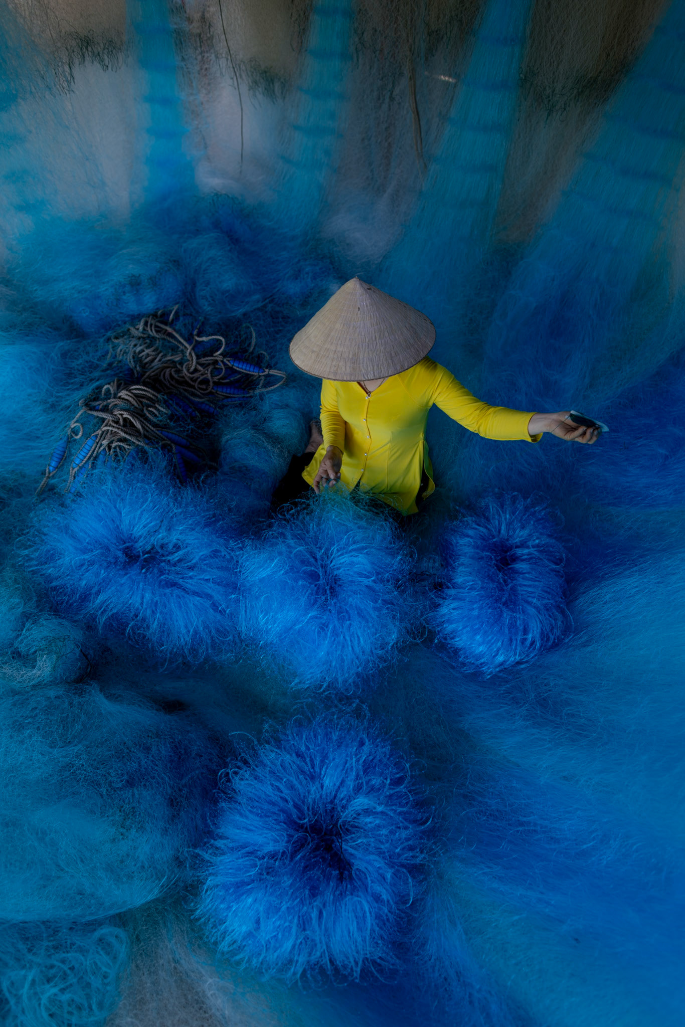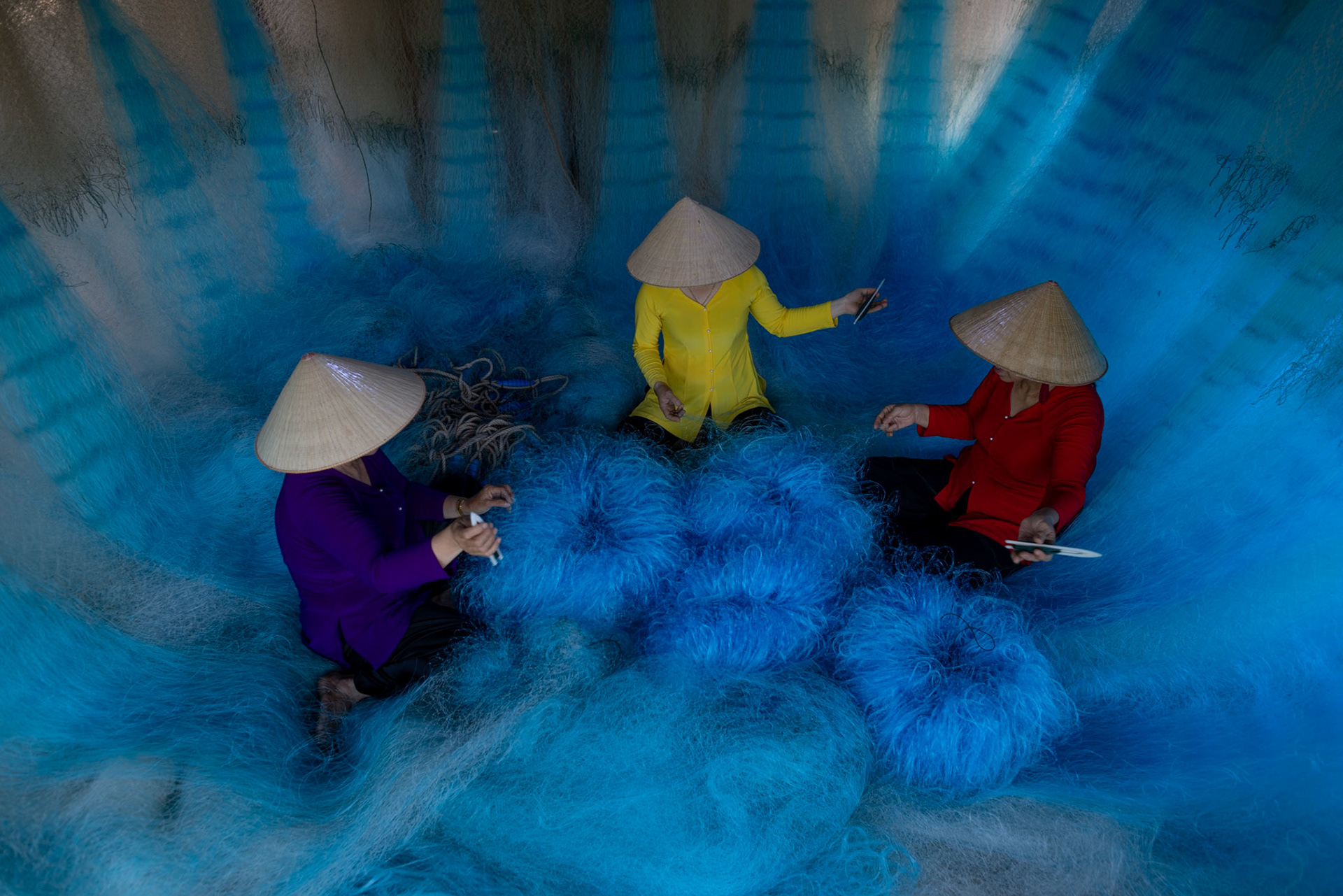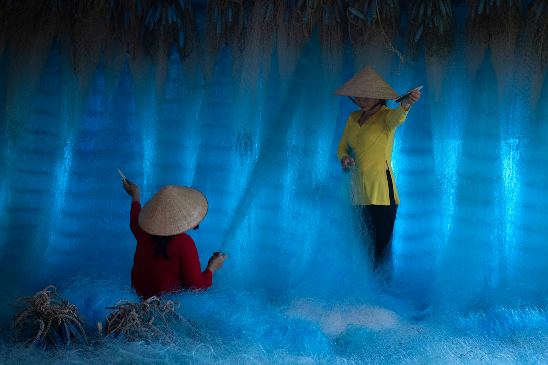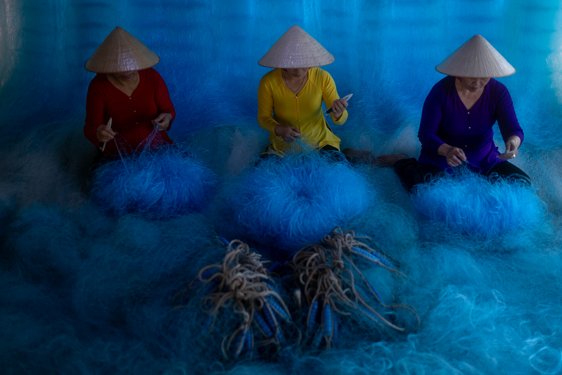 Step into the intricate, chaotic beauty of a traditional net weaving workshop. This visual essay explores the rhythmic labor and profound scale of an ancient craft. Bathed in a striking, natural color palette—where the cool, oceanic cyan of massive fishing nets meets the warm, golden light illuminating the workers—this series captures the atmospheric intensity of the environment. From the sweeping, geometric lines of the hanging nets to the intimate, calloused details of the hands that mend them, these images are a tribute to the focused artisans who weave the fabric of the sea. Vietnam 2026