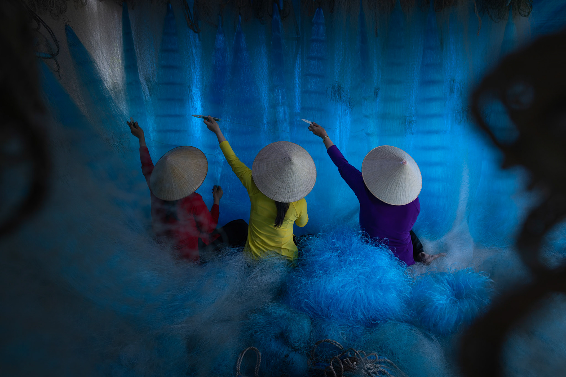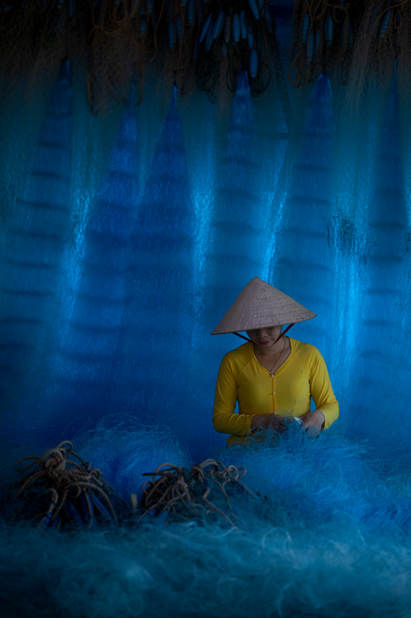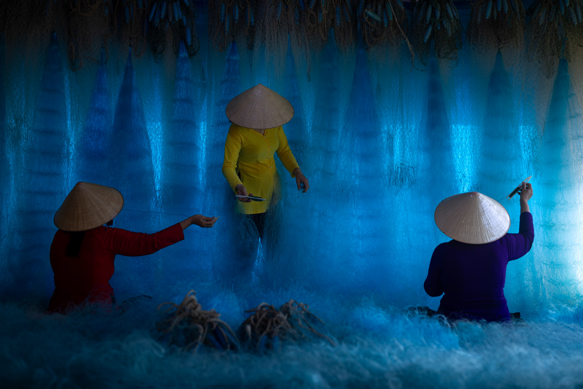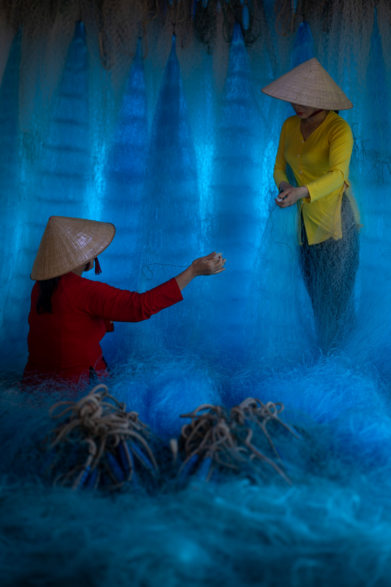Step into the intricate, chaotic beauty of a traditional net weaving workshop. This visual essay explores the rhythmic labor and profound scale of an ancient craft. Bathed in a striking, natural color palette—where the cool, oceanic cyan of massive fishing nets meets the warm, golden light illuminating the workers—this series captures the atmospheric intensity of the environment. From the sweeping, geometric lines of the hanging nets to the intimate, calloused details of the hands that mend them, these images are a tribute to the focused artisans who weave the fabric of the sea. Vietnam 2026