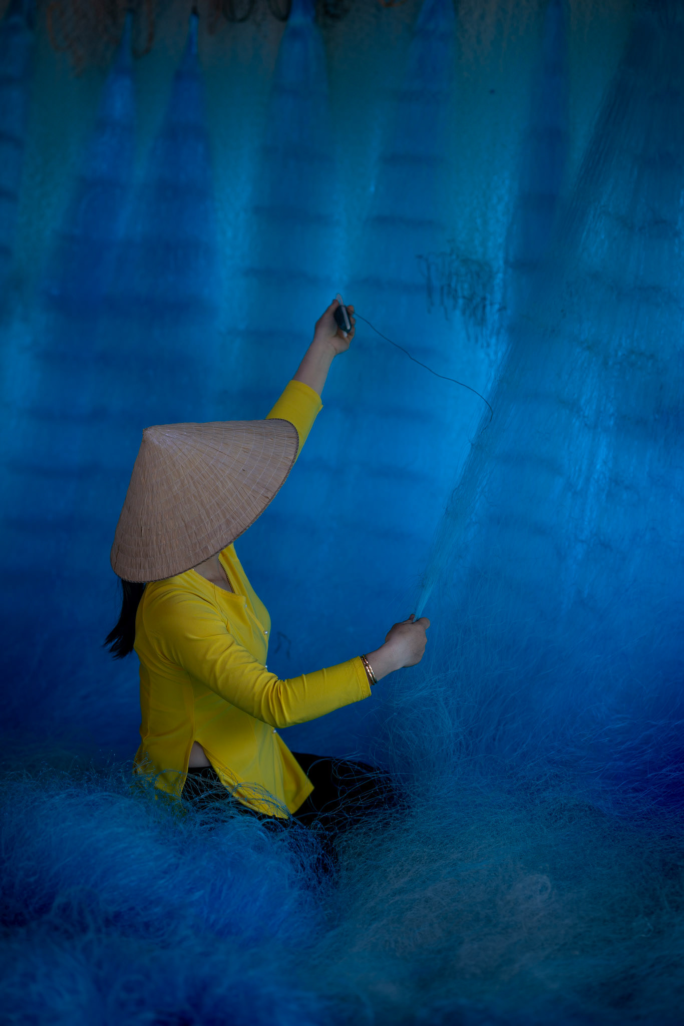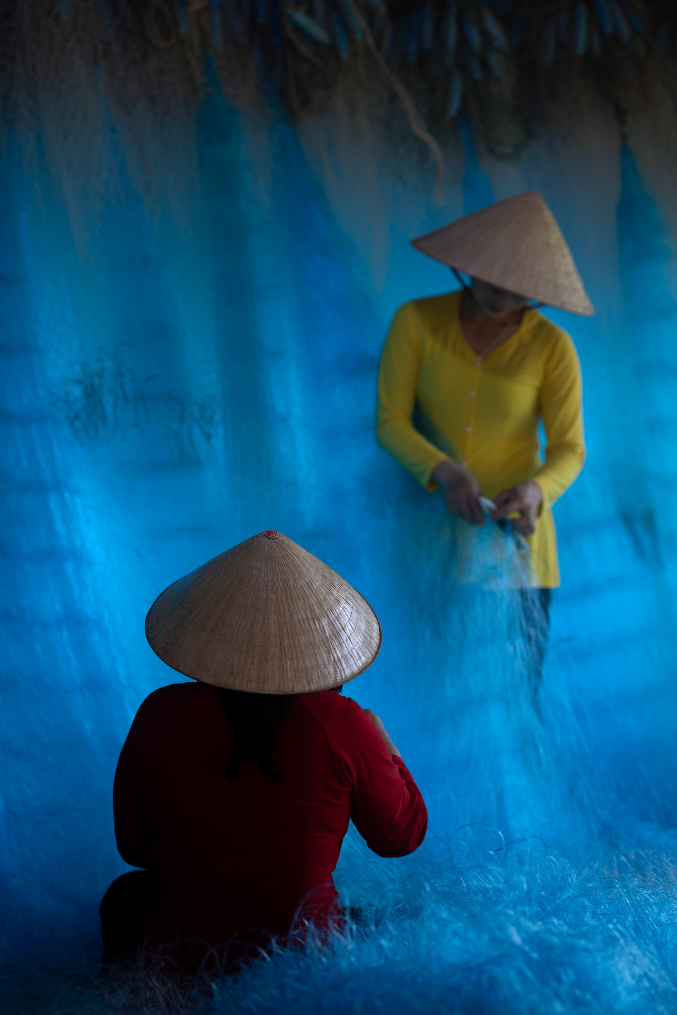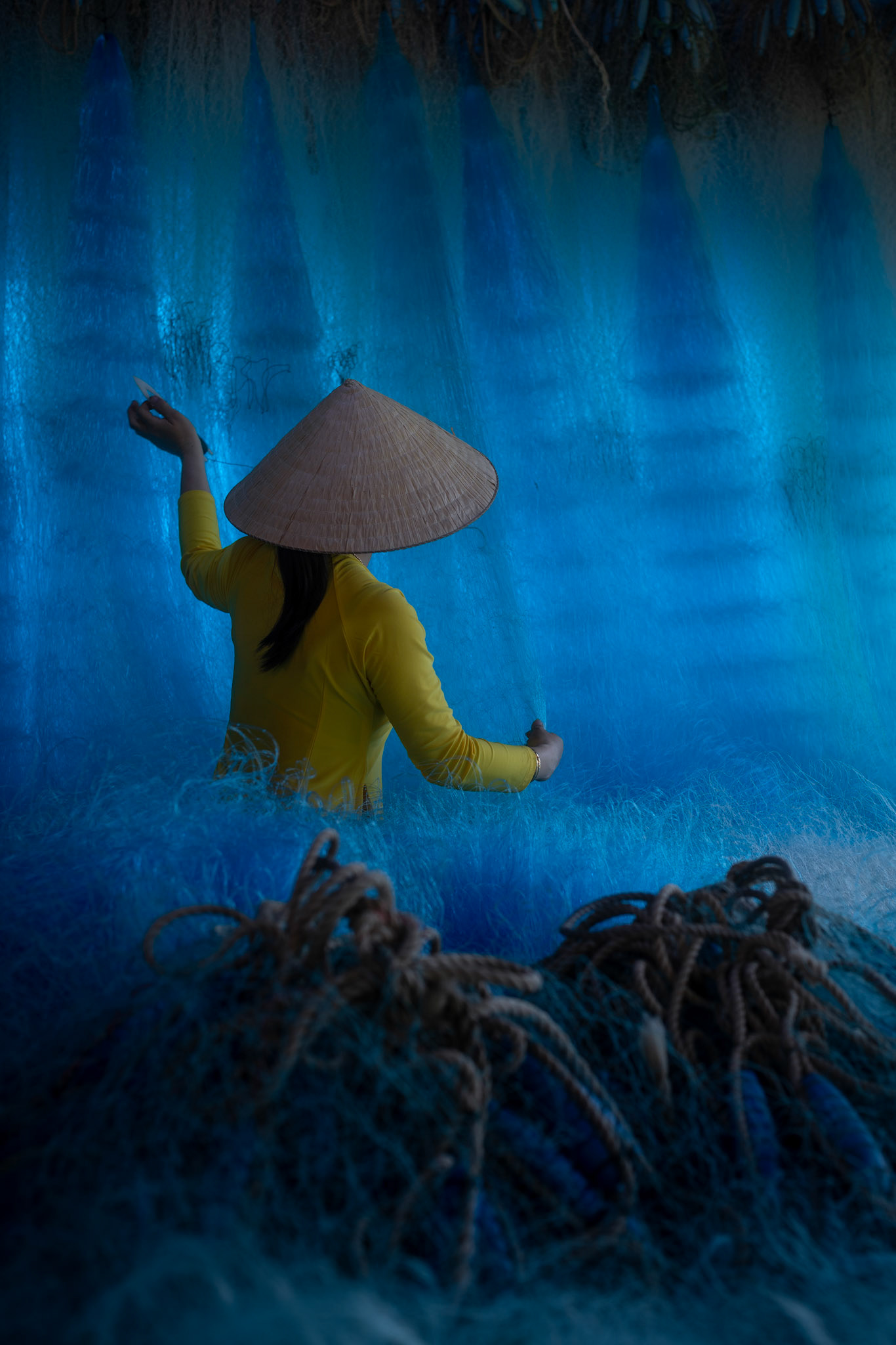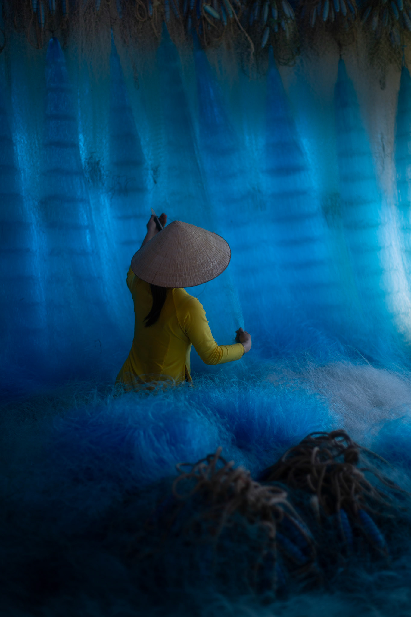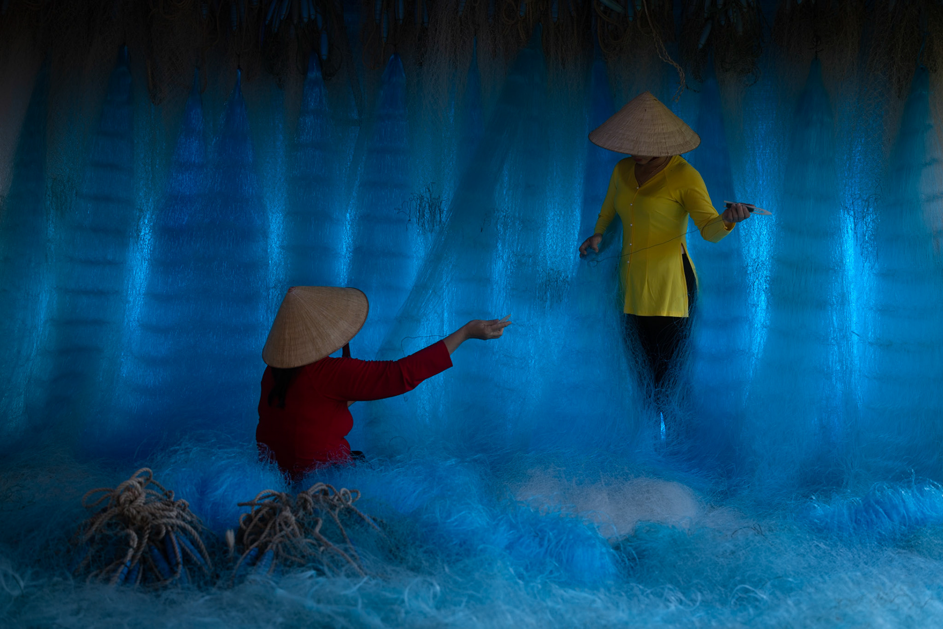 Step into the intricate, chaotic beauty of a traditional net weaving workshop. This visual essay explores the rhythmic labor and profound scale of an ancient craft. Bathed in a striking, natural color palette—where the cool, oceanic cyan of massive fishing nets meets the warm, golden light illuminating the workers—this series captures the atmospheric intensity of the environment. From the sweeping, geometric lines of the hanging nets to the intimate, calloused details of the hands that mend them, these images are a tribute to the focused artisans who weave the fabric of the sea. Vietnam 2026