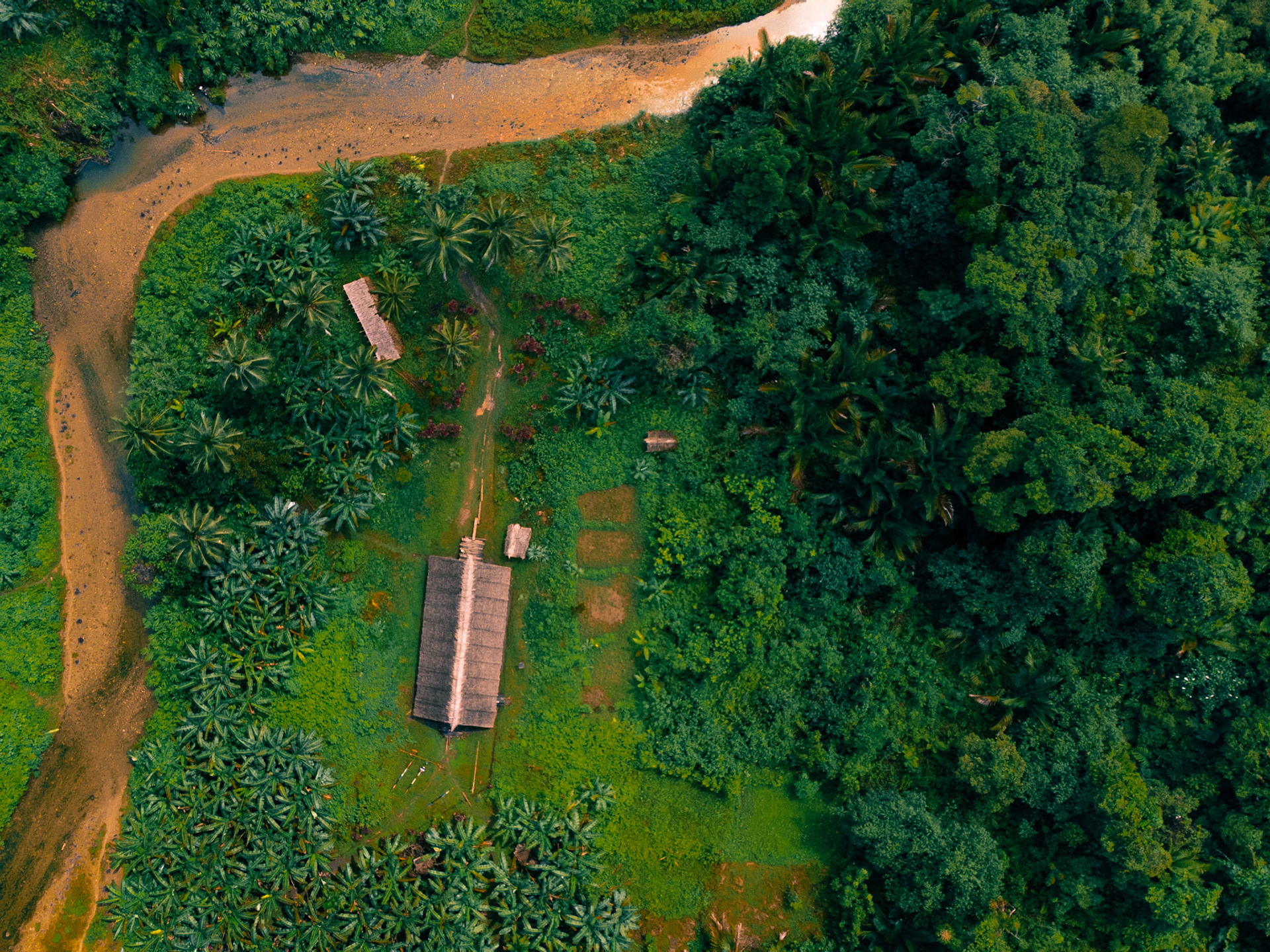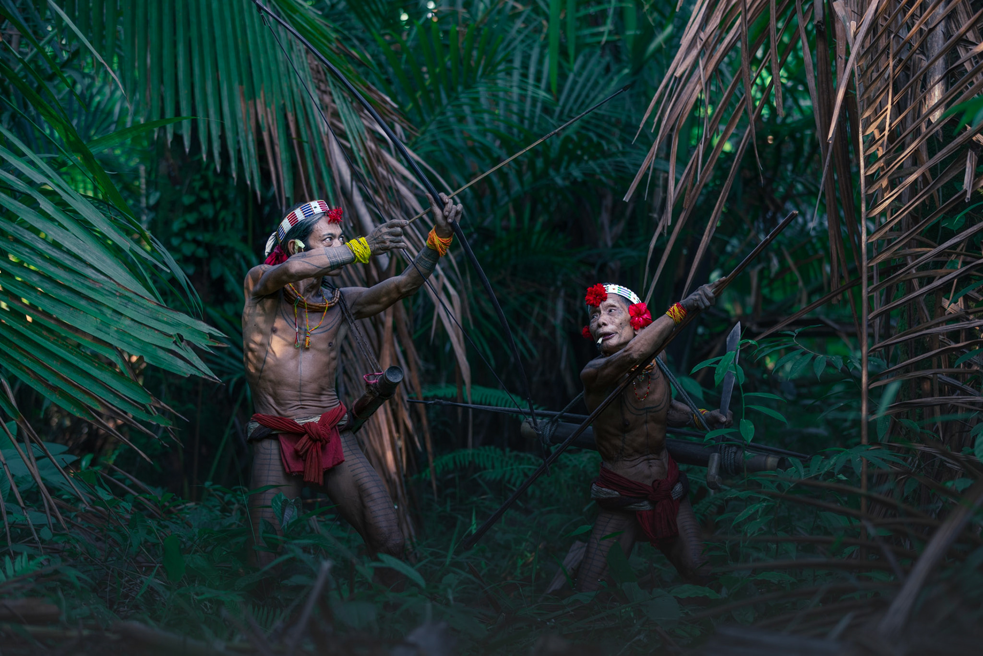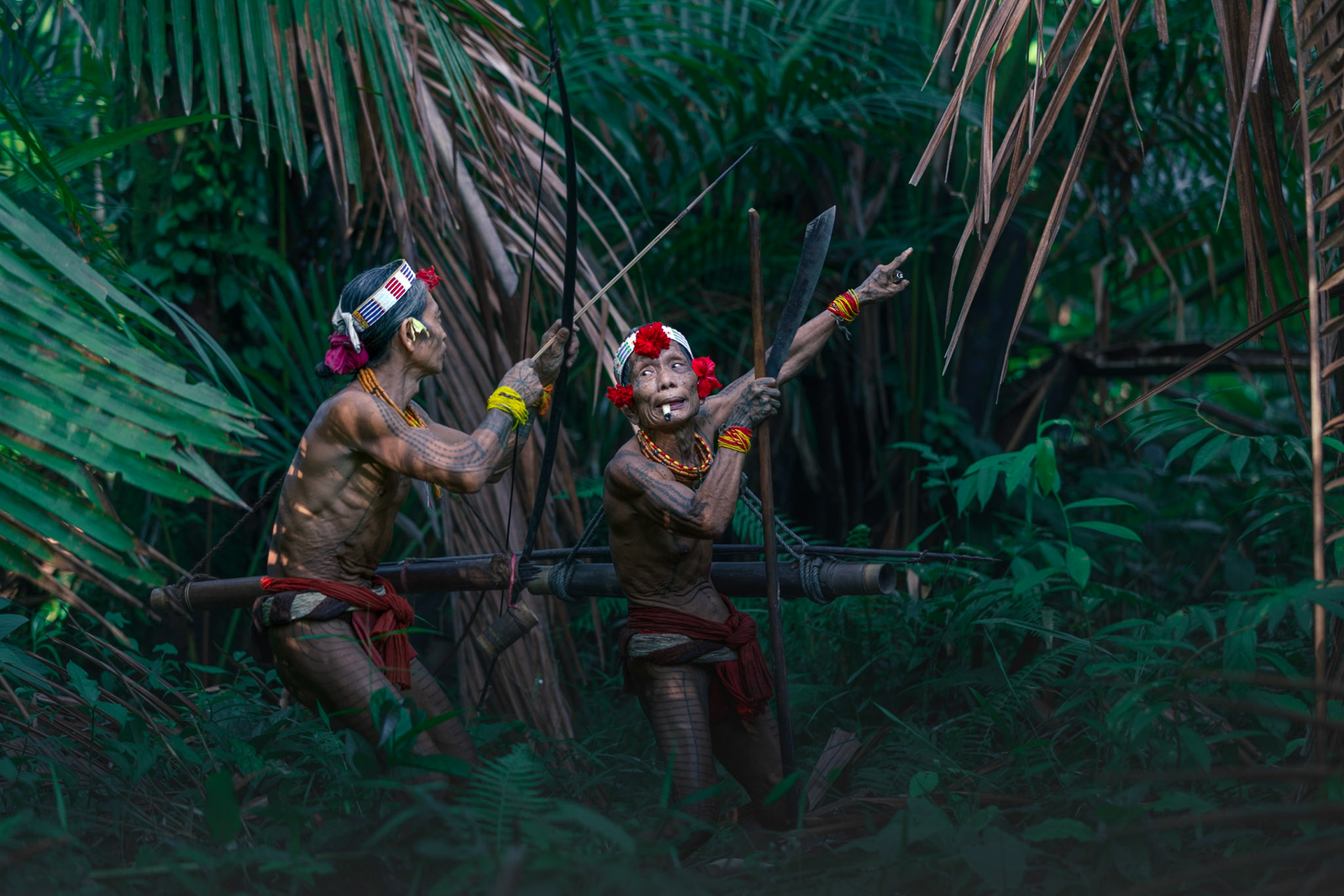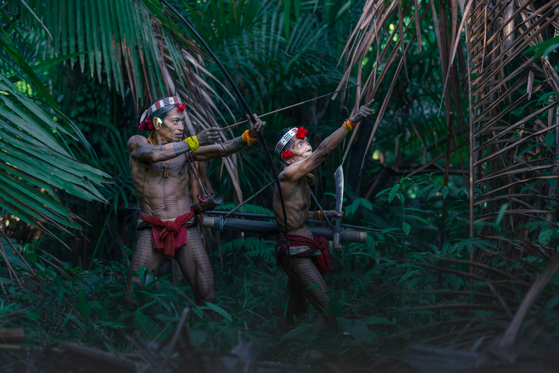 Lost in the Green — Two men framed by giant ferns and palms. The overwhelming saturation of green showcases the incredible biodiversity of the Siberut biosphere reserve, a world that remains largely untouched by modern development.