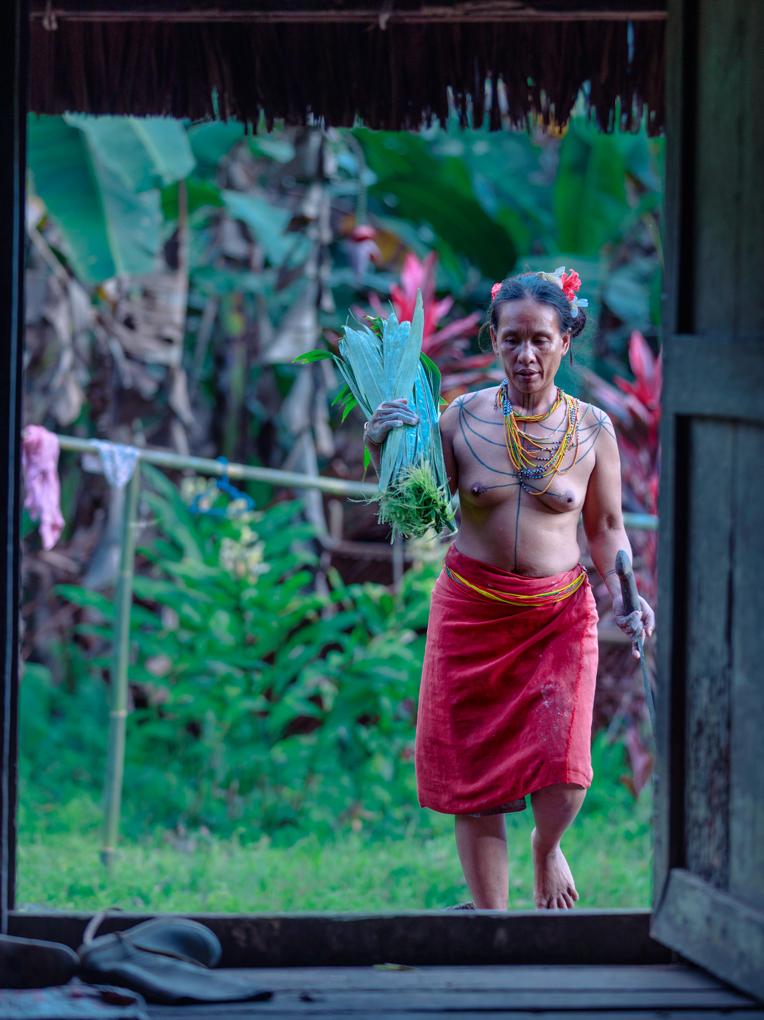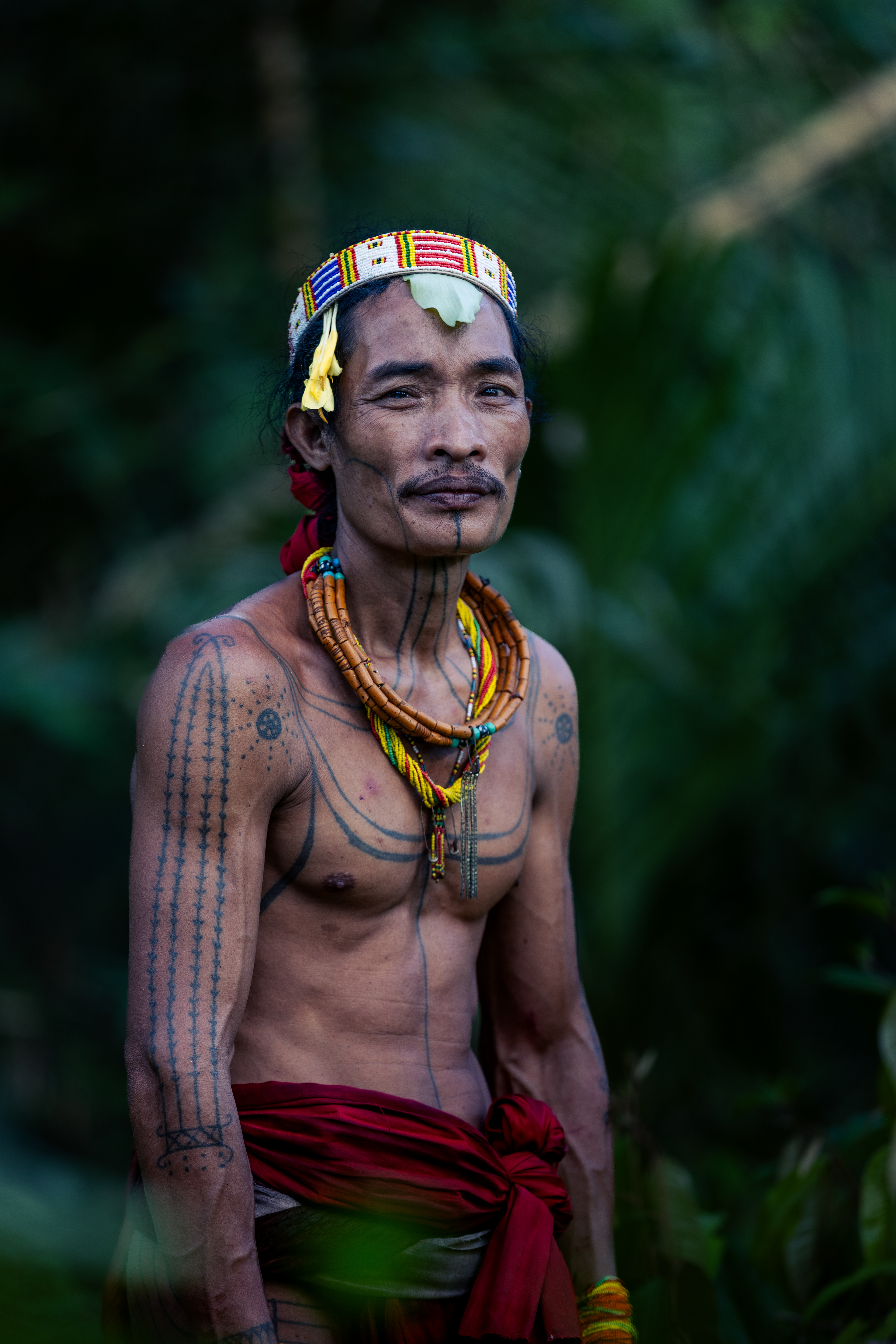 Emerging from the Green — A Mentawai hunter steps silently out of the dense undergrowth. His red loincloth (kabit) serves as a vibrant contrast to the endless sea of green, signaling his presence to the spirits of the forest while he navigates a path known only to his clan.